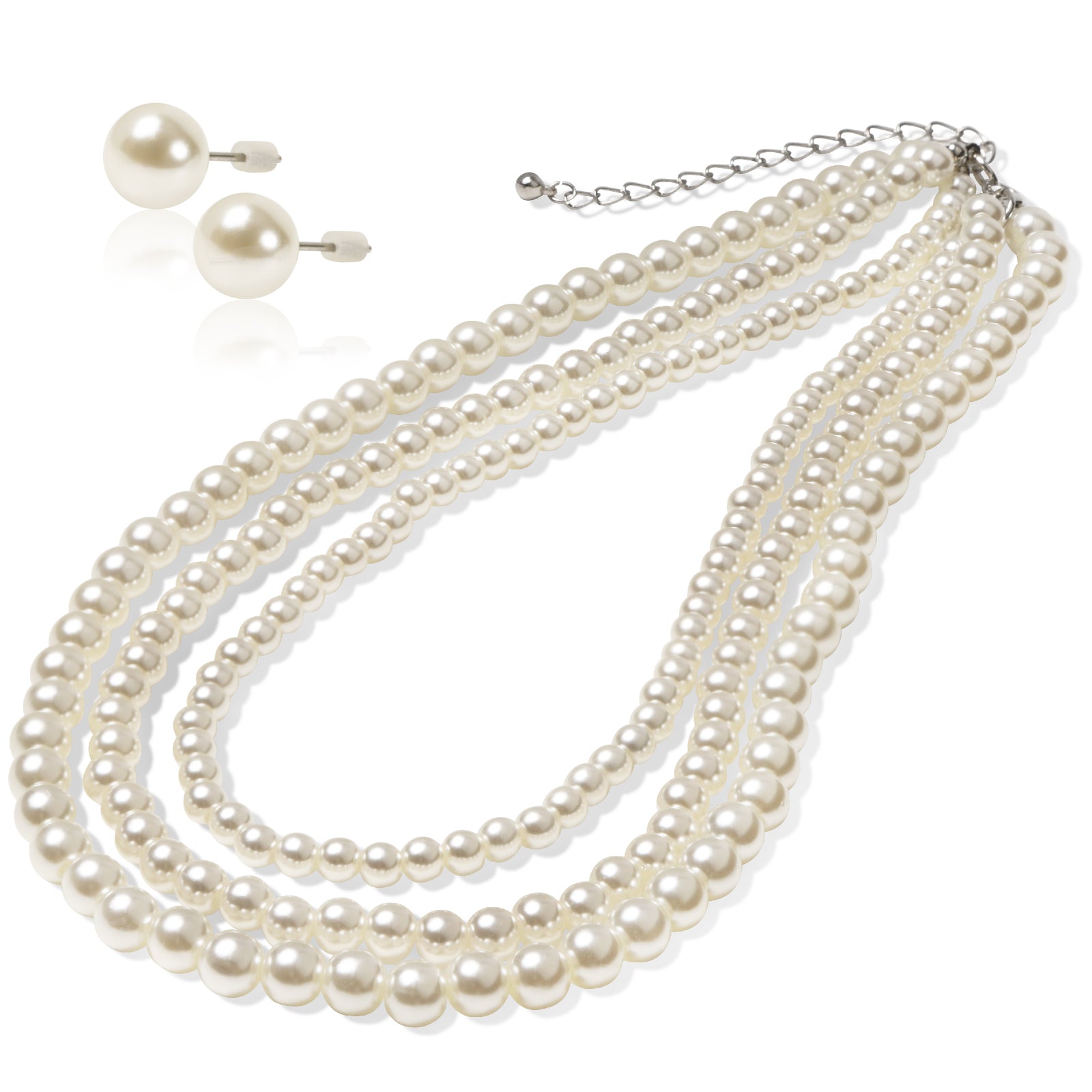 卒業式・入学式・結婚式・法事など、あらゆるフォーマルシーンに対応する定番の3連パールネックレス。ピアス付きセットです。